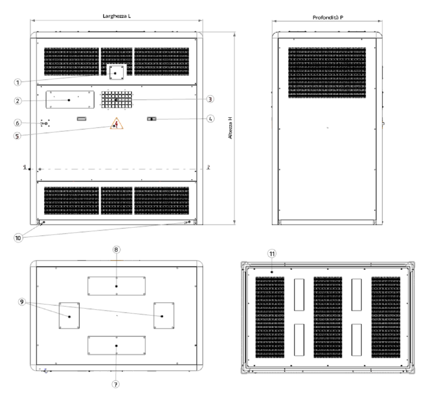 Costruzione | I Box protezione trasformatori serie "MODULA24" sono realizzati con lamiere pressopiegate con spessore 15/10 sia per la struttura che i pannelli, mentre il telaio di base è in lamiera 20/10 essi sono del tipo solidale con fissaggio direttamente su trasformatore | ||||||||