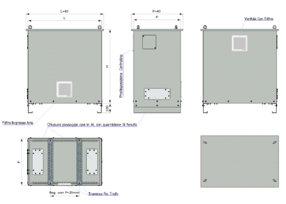 | I box trasformatori BT Serie BTRA sono del tipo pesante e realizzati in lamiera pressopiegata spessore 18,20/10 ideali per contenere trasformatori pesanti di facile inserimento Grado di Protezione IP23 elevabile fino a IP 54 con ventilazione forzata chiusure passaggio cavi e tamponamento cava centralina con guarnizione poliuretanica a colata continua, per garantire la tenuta all'acqua e polveri, così anche il tetto di chiusura è dotato di guarnizione a colata continua. predisposizione di golfari di sollevamento M8 e M10(optional) | I box protezione trasformatore BT Serie BTRM sono realizzati in lamiera pressopiegata e sono strutturalmente autoportati Predisposti per l'inserimento di centraline di controllo Forniti smontati con tutti gli accessori per il montaggio, incluse le istruzioni (su richiesta sono fornibili montati) Grado di Protezione IP20 e IP31 |
