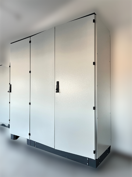 Porta frontale apribile a mezzo cerniere con possibilità di posizionare la stessa sia a destra che a sinistra.Il pannello interno di cablaggio viene eseguito in lamiera zincata con spessore di 20/10 e 25/10 ( in base alle dimensioni)